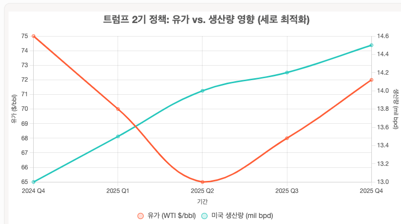 트럼프 전략의 유가 영향은 공급 확대가 핵심이야. White House 4월 9일 EO로 규제 예산 제로화, 드릴링 가속. Fox News 3월 11일 "국내 LNG 잠재력 해방"처럼 수출 허가 독점. 결과, 미국 원유 생산 사상 최대, 유가 하락 압력. 하지만 VT Markets 10월 13일 "WTI 59.4달러 상승"처럼 유럽 세션 변동. 나도 달라스 세미나에서 "셰일 증가로 OPEC 시장 점유율 위협" 들었어.
